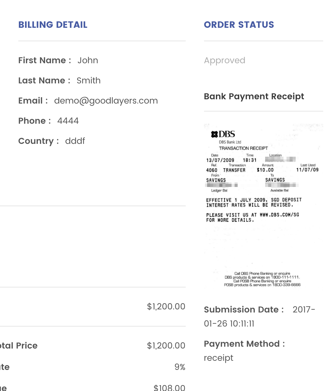 Now admin will be able to verify the receipt via admin’s backend. Admin will have option to approve or reject the receipt submission. After approving or rejecting, the system will send email notification to customer.